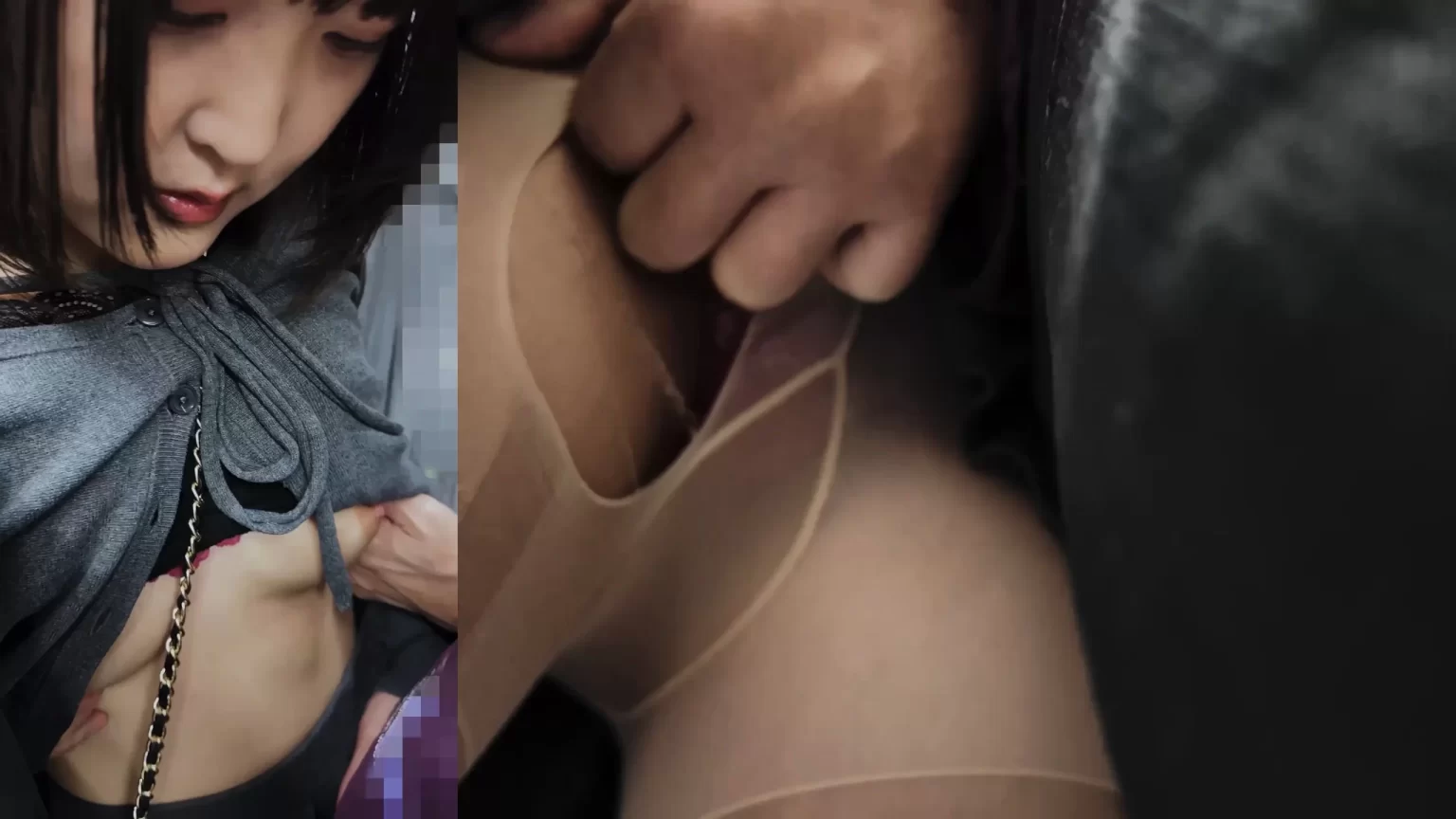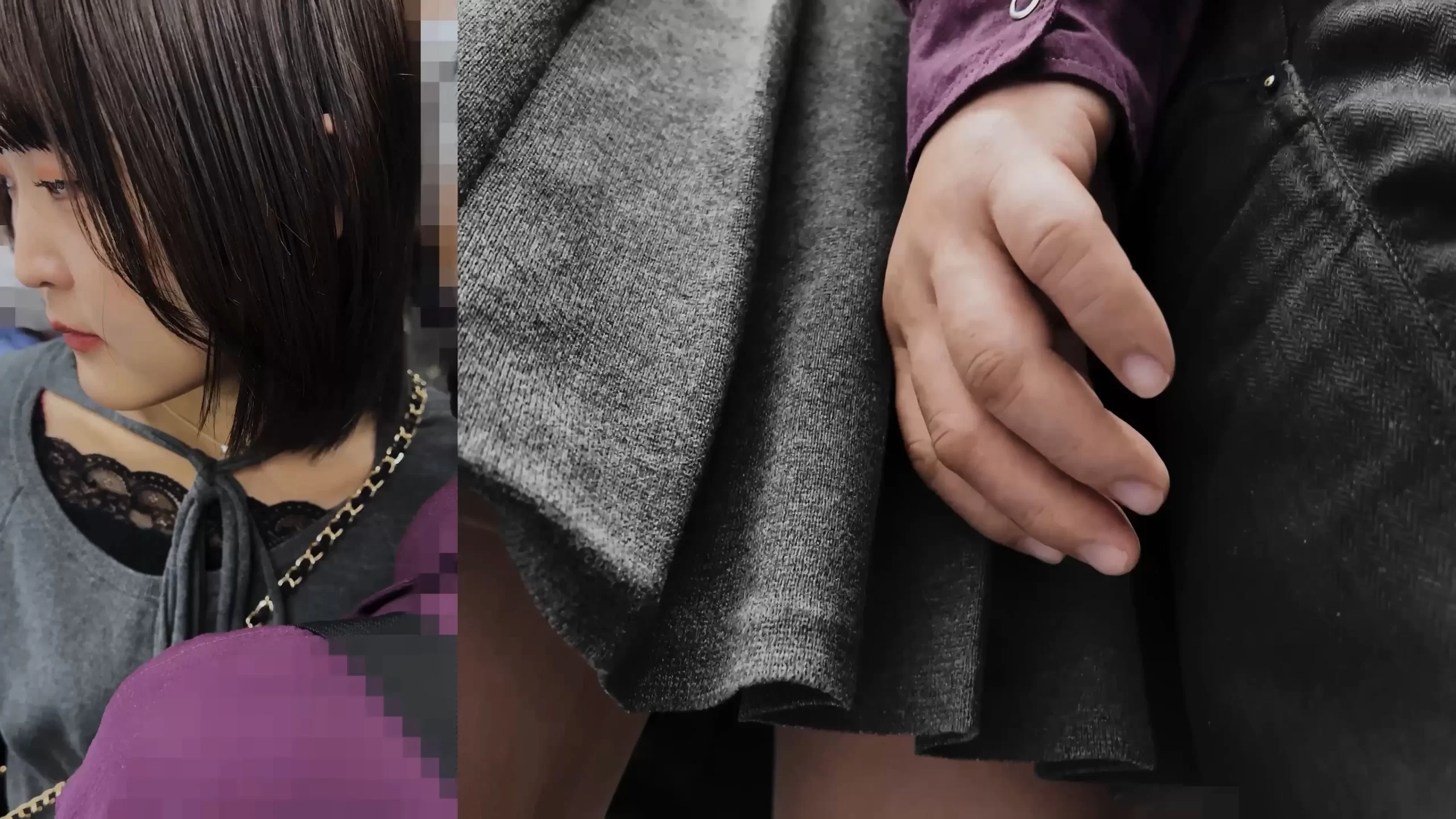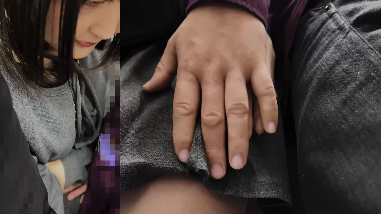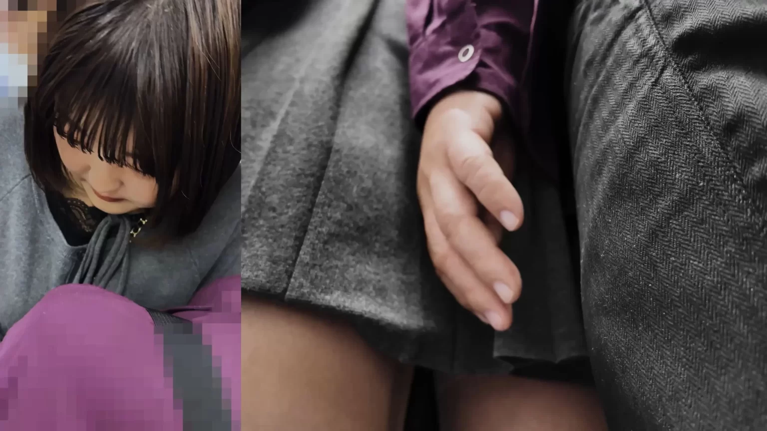 最近のトレンドは痴漢OK娘。こうして痴漢しても恐怖なのか諦めなのか全く抵抗しない子が増えているのだという。そんなOK娘が増えれば増えるほど良い思いをするのはこういう痴漢師なのです。この黒髪ボブ娘はパンストを破られて中指でがっつり手マンされています。しかも乳首も丸出し状態に。動画版は画像下のリンクからどうぞ。